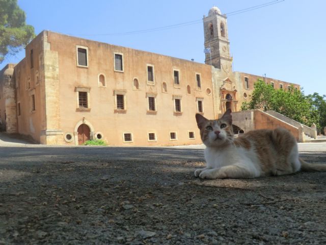 La mattina, dopo aver fatto un bel bagno mattutino sulla spiaggia proprio di fronte al camper, ripartiamo tornando verso nord per raggiungere Chanià (La Canea veneziana). Attraversiamo l’isola lungo le solite strade tortuose attraversando una miriade di paesetti con i relativi ingorghi e strettoie e finalmente arriviamo al camping posto ad ovest della città (confusionario e senza spiaggia ma dotato di ogni servizio). Scesa la vespa (ma è possibile andarci anche in autobus, che ha la fermata di fronte al camping, o anche comodamente in camper) andiamo a visitare la bella città e specialmente la interessantissima penisola che si estende dalla città verso nord. Qui cerchiamo e troviamo monastero di Moni Agia Triada costruito dai veneziani in stile rinascimentale. Ancora abitato da dei vecchissimi monaci è un’oasi di pace. Poi, mai stanchi, proseguendo verso nord sempre sulla penisola, troviamo un secondo monastero di clausura: Moni Gouvernetou. Qui, dal cortile esterno, riusciamo ad ascoltare, nel silenzio più assoluto, i monaci recitare le loro preghiere (che somigliano a dei mantra….). Seguendo le indicazioni della guida però non ci fermiamo ancora ed anzi, proseguendo ancora a piedi, scendiamo fino al mare incontrando, lungo il sentiero, una antichissima grotta trasformata in chiesetta dai monaci ed un terzo monastero (abbandonato): Moni KatoliKò. Scesi fino al mare e fatto un bel bagno ristoratore nel minuscolo porticciolo ricavato alla base della gola (costruito a suo tempo dai monaci ed al servizio dei soprastanti monasteri) risaliamo e ritorniamo in città per passare una bella serata sul porto tra canti di piazza e feste popolari. Un’ottima cenetta in una delle “taberne” consigliate dalla guida (€ 11 a persona) ci fa finire la piacevole giornata.