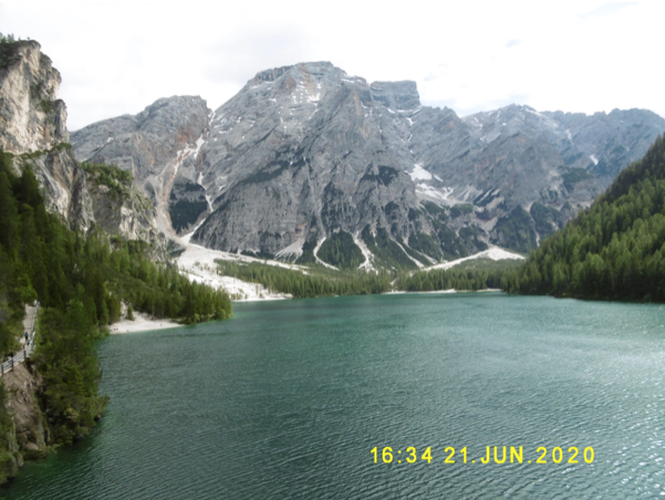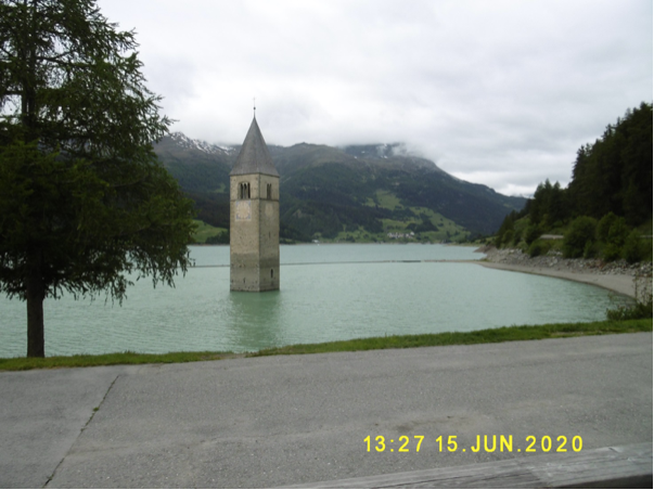 Giunti in prossimità del lago Resia sostiamo nel grande parcheggio sulla sinistra, sul lago: 1 euro all’ora. Merenda e camminata lungo lago. Il giro completo è di 14 km, noi ne compiamo circa la metà, sta per piovere, arriviamo sino alla partenza degli impianti di risalita, in prossimità del paese di Resia. Notiamo un’area sosta camper, 10 euro al giorno, su un terra battuta, priva di qualsiasi servizi e senza alcun albero con 1 solo camper. Ritorno al parcheggio, foto di rito al caratteristico campanile che emerge dalle acque, sepolto parzialmente dalle acque che hanno riempito l’invaso negli anni 50 per creare il lago (2a foto).