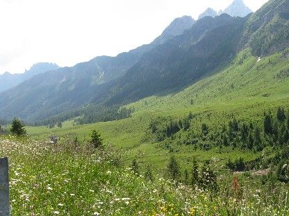 Il viaggio ci impone di continuare verso il Passo Falzarego, ora per me è tutto nuovo per una strada mai percorsa, giù dal passo sarebbe d'obbligo salire verso il Pordoi, preferiamo scendere tranquillamente ad Alleghe per risalire verso il passo Pellegrino verso Moena, ma come sempre andando alla ricerca di novità e saliamo per il passo Valles, poco frequentato fra una natura incontaminata e alpeggi sterminati.