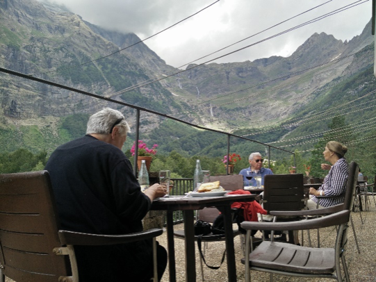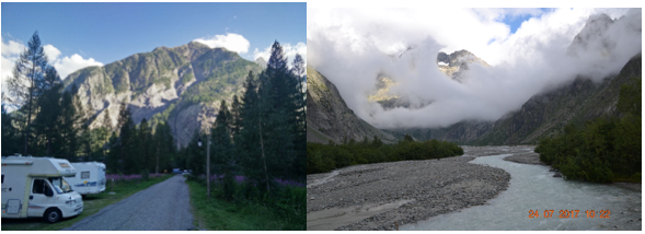 Ailefroide, villaggio montano nel parco, con campeggio diffuso ed area sosta camper, dove ci fermiamo. Siamo circondati da altissime vette. Dopo un breve riposo, andiamo a cena al ristorante dell’albergo