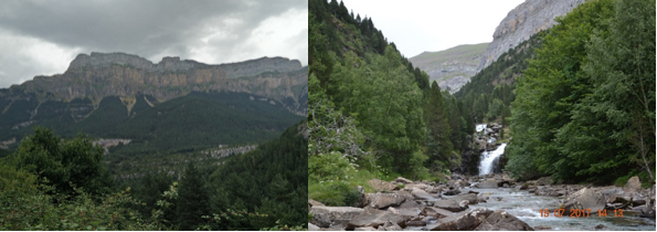 Torla, dove parcheggiamo il camper e prendiamo il bus navetta per Ordesa. La strada si inerpica per un paesaggio mozzafiato di imponenti torrioni rocciosi. Scesi a Ordesa, iniziamo la passeggiata verso le 10:00. Attraverso il bosco, passate due cascate, raggiungiamo una piana alle ore 13:00 con magnifica vista sulle montagne.