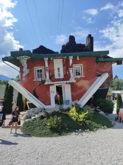 Casa Capovolta, si può andare a piedi/bici è presente un marciapiede che arriva fino alla Casa, ingresso € 44, compreso nel prezzo il parco Dinoland che noi non abbiamo visitato.