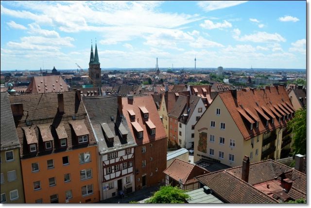 Il camping è accanto al Nurnberg Messe, centro congressi alle porte della città. Dobbiamo però camminare una mezzoretta per orientarci ed individuare la fermata della metropolitana che scopriamo essere giusto dalla parte opposta del centro stesso. La fermata (che ha lo stesso nome del centro congressi) è della linea U1 ed in una decina di minuti conduce in centro (fermate Hauptbahnhof oppure Lorenz Kirke), per l'esattezza su Konigstrasse, via pedonale che unisce i luoghi simbolo della città. Oggi è domenica ed i negozi tutti chiusi, ma non mancano molti turisti ed è tutto un brulicare di persone ovunque. Passiamo davanti alla chiesa St. Martha, sede dei "Maestri Cantori di Norimberga", e la gotica St. Lorenz quindi giungiamo nella piazza principale, la Hauptmarkt, dove possiamo ammirare anche la Schöner Brunnen, originale fontana a forma di pinnacolo alta 19 metri, ricchissima di particolari tutti dorati nel quale cancello trova posto un anello che, se ruotato su se stesso per tre volte consecutive, si dice porti fortuna (e noi come tutti del resto, non possiamo resistere alla tentazione …). Proseguiamo verso il Burg, maestosa fortezza che domina la città, all'interno del quale si trova il Kaiserburg, residenza della famiglia imperiale. Tornando indietro passiamo davanti all'ex ospedale di S. Spirito (Heilig Geist Spital) sulle sponde del Pegnitz e nuovamente su Konigstrasse ci fermiamo a mangiare sotto il gazebo di uno dei tanti bar/ristoranti presenti, unici esercizi commerciali oggi aperti. Verso le 18.00 riprendiamo la via del ritorno e dopo 45 min circa siamo nuovamente in campeggio dove replichiamo la serata precedente … NB Per la metro abbiamo acquistato un biglietto da € 8,50 cumulativo per gruppi fino a 6 persone (di cui max due adulti) e valevole sull'intera tratta e per 24 ore.