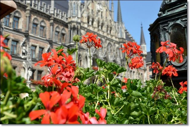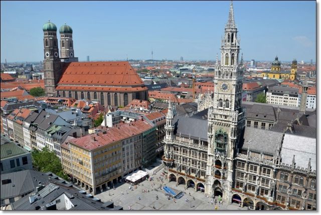 Alla cassa del campeggio acquistiamo il biglietto del bus cumulativo (€ 10,90 per l'intero nucleo familiare, valevole su tutta la tratta fino alle 6.00 del giorno seguente) e con la navetta 135 (frequenza ogni 20 min) raggiungiamo la fermata della metro U-Bahn: percorso brevissimo (un km circa) che volendo potrebbe anche essere effettuato a piedi. Di qui prendiamo la U3 ed in poche fermate siamo in Marienplatz, vero centro di Monaco. Sulla piazza domina la sede del municipio, imponente edificio neogotico caratterizzato dalla presenza di una torre alta 80 metri che ospita il famoso Glockenspiel, il più grande carillon della Germania che si aziona tre volte al giorno: alle 11.00 alle 12.00 e nei mesi estivi anche alle 17.00. Visitiamo anche la Frauenkirche, cattedrale famosa per i due campanili gemelli alti quasi 100 metri, altro simbolo della città. Ci spostiamo quindi nel vicinissimo Viktualienmarkt, il più famoso mercato scoperto di Monaco. Un'area di oltre 20.000 mq dove si trovano ordinatissime bancarelle che vendono ogni sorta di prelibatezza alimentare, oltre a numerosissimi locali dove consumare cibi di ogni tipo. Noi scegliamo insalata a base di gamberi ed immancabile birra fresca: il tutto, come sempre, su grandi tavolate all'aperto in compagnia di una miriade di turisti mescolati ad abitanti del luogo. Visitiamo poi, ma solo dall'esterno, Residenz, il palazzo reale di Monaco e passeggiamo tra negozi di souvenir ed altri extra lusso dove ci sono gioielli da centinaia di migliaia di euro! Nel tardo pomeriggio facciamo rientro al camper e dopo cena una passeggiata nel grande parco dove scorre il fiume Isar e trova posto il campeggio.