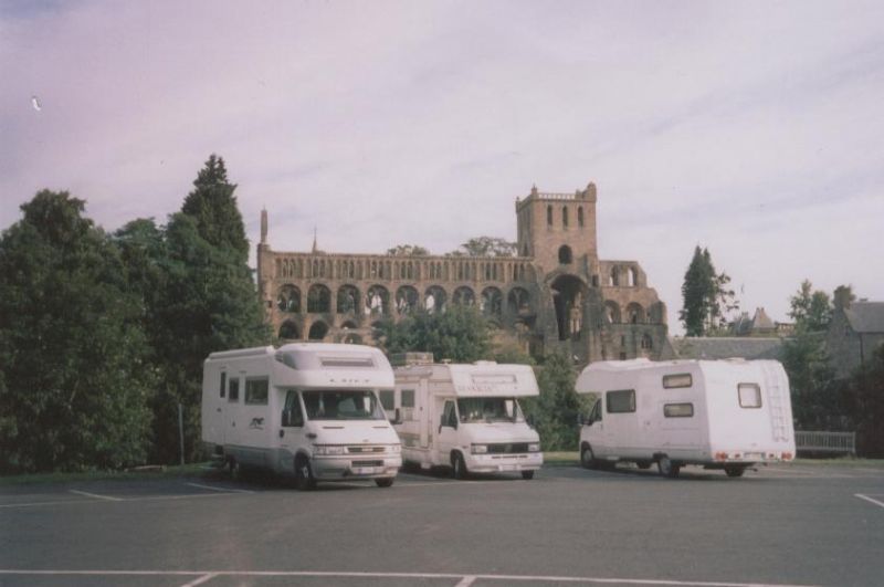 P a Jedburgh nel parcheggio sul fiume a lato dell’abbazia, in compagnia di alcuni camionisti che dormono sul mezzo. Asfaltato e illuminato. Bel tempo tutto il giorno.