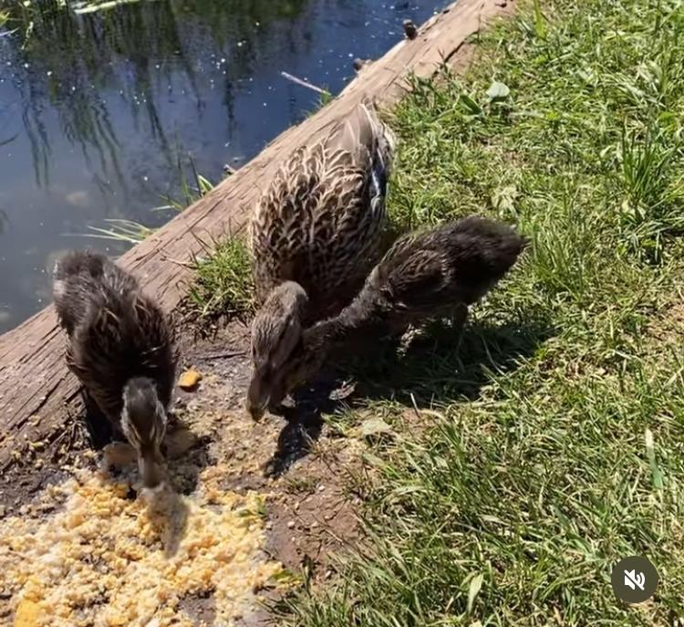 Nel lago ci sono papere e pesci rossi grandicelli.