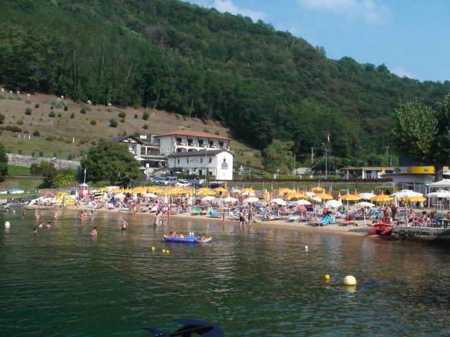 Pur essendo una giornata molto calda, un venticello ha spirato tutto il giorno rendendo la permamnenza anche nelle ore centrali della giornata gradevole. Abbiamo giocato con la sabbia,nell'acqua tutto il giorno (breve escruzione con il pedalò tutti con scivolo che per i bimbi grandi va bene per noi è stato solo d'impiccio nel gestire le due birbe). Ovviamente con un'acqua così bella e fresca, al sabbia e il fondale che degradava lentamente le bimbe erano sempre in acqua. Non pensavo ad un pienone e infatti alla fine la spiaggaia è stata occupata per poco + della metà dei posti disponibili. Nonostante questo e la presenza di tanti bimbe tutto era tranquillo e rilassato. Paesaggio e vista bellissime: sullo sfondo l'isola di san Giulio e il sacromonte, la Madonna del sasso più lontano e infine le alpi.