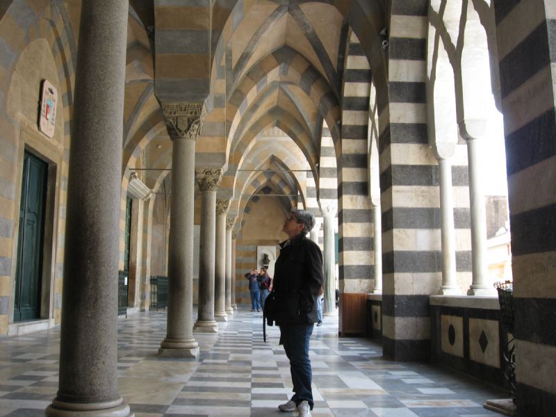 In alto lo scenario dei monti, punteggiato da case in basso e una trama pittoresca di vicoli e scale sino alla grande piazza dominata dal celebre Duomo con la sua imponente facciata illuminata da smalti e mosaici dorati . Saliamo la maestosa scalinata per entrare nel Chiostro Paradiso e ammirare gli archi intrecciati sostenuti da 120 esili colonnine e proseguire all’interno della sontuosa cattedrale.