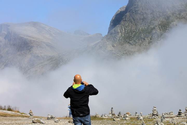 Oggi prendiamo il traghetto per andare ad Åfarnes e da qui verso la magnifica "strada del troll" la strada vista dal basso toglie il respiro fra cascata e nuvole basse saliamo in vetta. Peccato che le nuvole non facciano vedere tutto lo spettacolo che si può solo immaginare. Ma il meglio doveva ancora arrivare... proseguiamo e davanti a noi si apre un panorama a dir poco straordinario! Alte cime innevate, cieli azzurri, laghetti stiamo costeggiando il Reinheimen nasjnalpark.