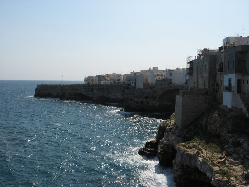 Lunedì 24 agosto - decidiamo di andare in moto a Polignano a mare, il paese è molto suggestivo, le case a strapiombo sul mare azzurro e verde con le onde che si infrangono contro piccole insenature sabbiose e poi tanti scogli.Non riusciamo a fare il bagno perché il mare è troppo mosso ma è comunque piacevole restare a bagno tra le rocce basse.
