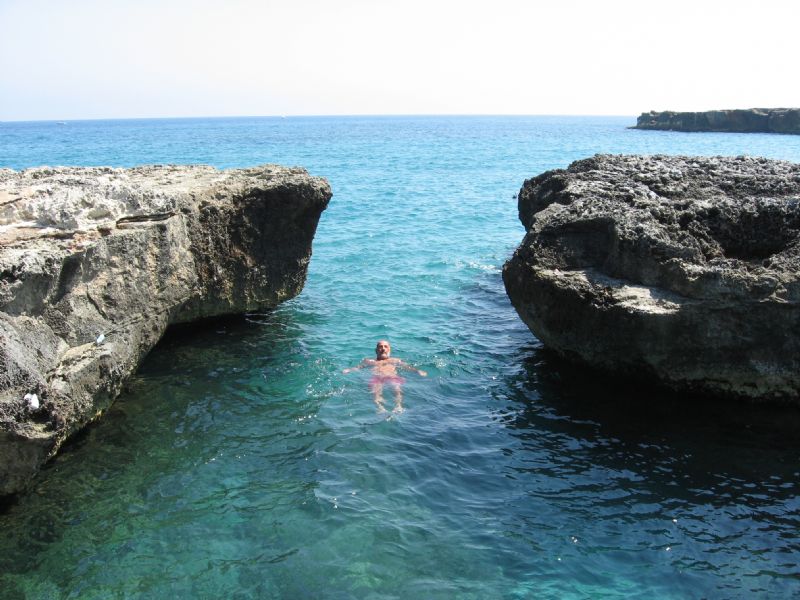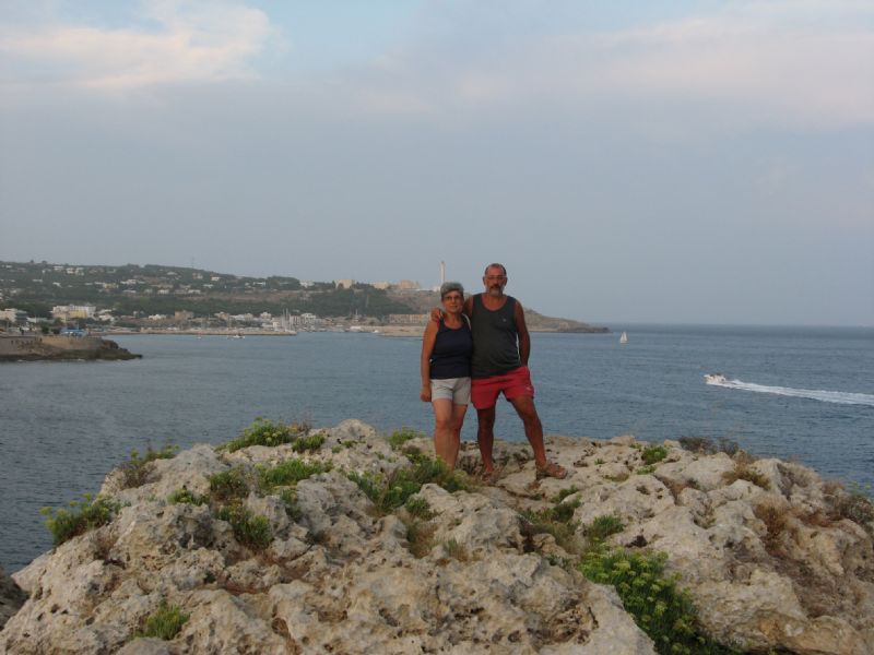 Mercoledì 26 agosto, siamo in ferie quindi con la dovuta calma, ripartiamo per Lecce.Parcheggiamo al Camper Park Fuori Le Mura, molto tranquillo con servizi.(15 euro).Gabriele, ci accompagna con il suo pulmino Fiat 850 del 1966 in città dove si festeggia S. Oronzo e anche qui le luminarie sono in tutte le vie, nella piazza c'è un enorme cupola di luci colorate ed è festa, festa in ogni angolo in ogni piazza.Ceniamo al ristorante "Il Latino" e poi anche noi passeggiamo in mezzo alla folla ascoltando musica. A fine serata ci ritroviamo in piazzetta battendo le mani a ritmo di una coinvolgente Taranta, suonata e ballata da giovani leccesi.Giovedì 27 agosto, continua la discesa, Arriviamo a Roca Vecchia litoranea S. Foca - Torre dell'Orso, parcheggiamo davanti al ristorante pizzeria Rokamel. Arrivati al mare ci rendiamo conto della meraviglia di questa costa che ha , tra le rocce, piscine naturali con acque cristalline dove noi passiamo l'intera giornata tra sole e bagni. A sera , considerato il numero di camper che si sono aggregati nel parcheggio, decidiamo di fermarci per la notte e andiamo a mangiare delle ottime cozze al ristorante del parcheggio.