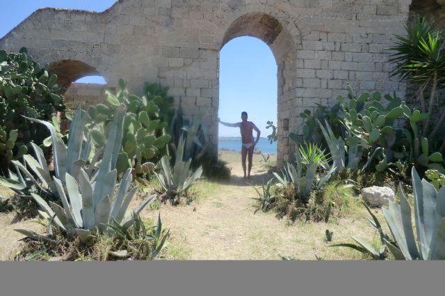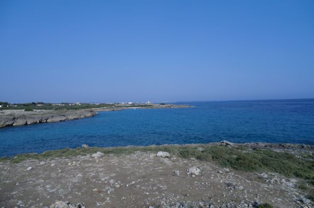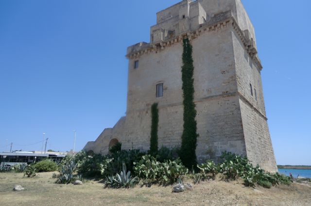 09.07 Ripartiamo e dopo un breve ritorno a S. Isidoro per fare il pieno di acqua potabile, ci spostiamo verso Punta Prosciutto, ma decidamo di fermarci a Torre Castiglione dove vediamo che in riva al mare alcuni camper fanno sosta libera. Qui ci sono scogli e spiaggia attrezzata e libera. Nel paese non c'è nulla, solo seconde case, ma vari fornitori col furgoncino portano ogni giorno pane, mozzarelle, frutta ecc. Ci fermiamo due notti.