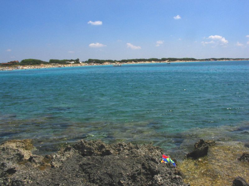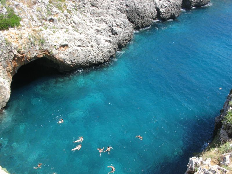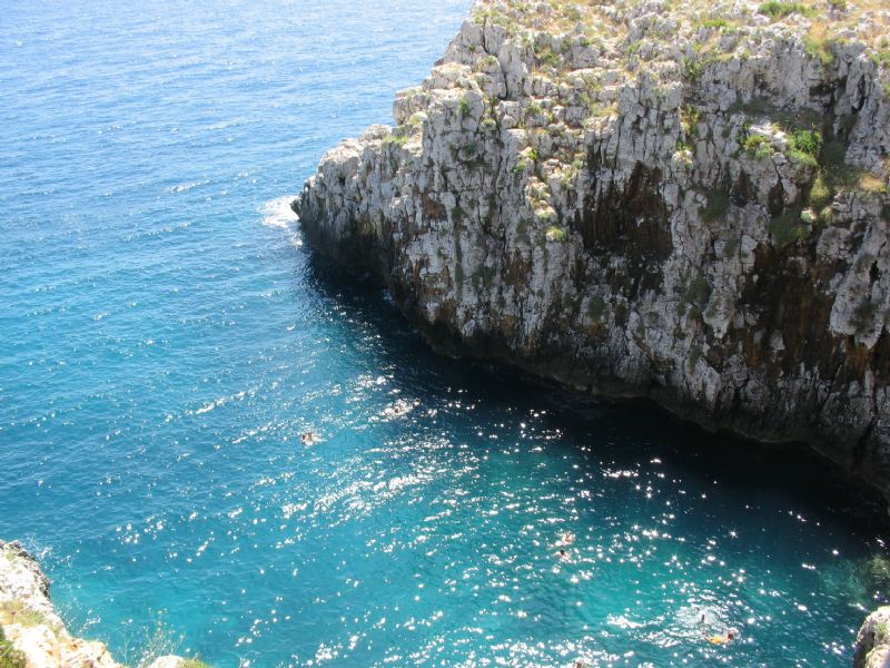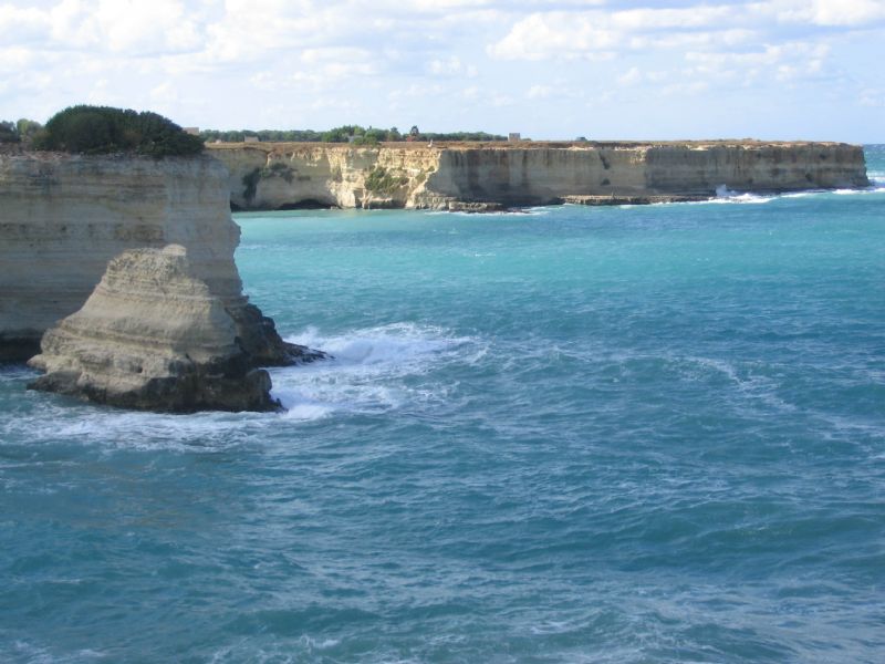 Pochi km più avanti troviamo un venerdì sera Porto Badisco con la sua insenatura dove si dica sia approdato Enea, con la pizzeria che porta questo nome, dove per loro pizza da asporto, significa che te la portano al camper con il piatto con anche qui un mare che sott'acqua ti lascia senza parole; il viaggio continua con il fiordo del Ciolo, dopo la grotta Zinzulusa e Castro, per girare su S.Maria di Leuca oltrepassando gli svariati paesini, dove i due mari si uniscono tra il blu e l'azzurro: intravediamo le Maldive salentine, (Torre Pali e dintorni) che non offrono opportunità di sosta libera notturna,ma tollerata di giorno, per cui evitando le multe opto per la sosta a Torre Mozza... e poi Gallipoli con lido Conchiglie e il Ristorante Maruzzella, del quale ho conservato incredulo il conto da mostrare agli amici, (66 euro in 4) e S.Maria al Bagno con le sue 4 torri sul mare e le piscine naturali dove sgorgano polle di acqua dolce (un aspetto un pò comune in tutta la zona) e la zona marina protetta di Porto Cesareo, con Porto Selvaggio e Torre Uzzullo con in mezzo S.Isidoro con la sua Torre sul mare che ci ha ospitato tranquillamente per 3/4 giorni in fasi alterne, senza tanti problemi in compagnia di altri camper.