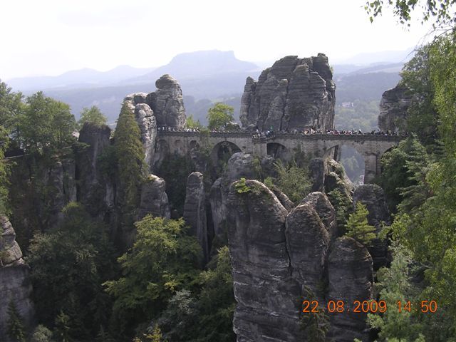 Preferiamo tornare in camper a Dresden senza utilizzare i mezzi pubblici, sosta nel parcheggio a pagamento e passeggiata tra gli innumerevoli monumenti storici un po’ anneriti dal tempo e dallo smog. Proseguiamo per il castello di Pillnitz, ampio parcheggio dove si potrebbe anche pernottare, ma quella sera c’è un concerto e perciò ci sarà molta ressa. Bellissimi e immensi i giardini, poco interessante gli interni. Ci spostiamo verso Bastei una delle zone più frequentate della Sassonia. Qui lo scenario è veramente spettacolare. Si cammina a piedi su e giù per scalinate e ponti per raggiungere gli innumerevoli speroni rocciosi che sovrastano il fiume Elbe.