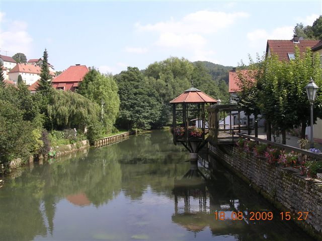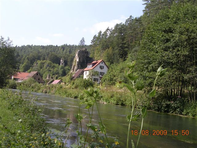 Sosta ad Hersbruch in parcheggio camper vicino alle terme 6 € a notte. Visita del grazioso paesino con numerosi edifici storici. Nel pomeriggio giro in bici per pista ciclabile lungo le gole del fiume Pegnitz, sino a Velden, picchi rocciosi accompagnano il percorso segnalato infatti con il simbolo di un picco roccioso.