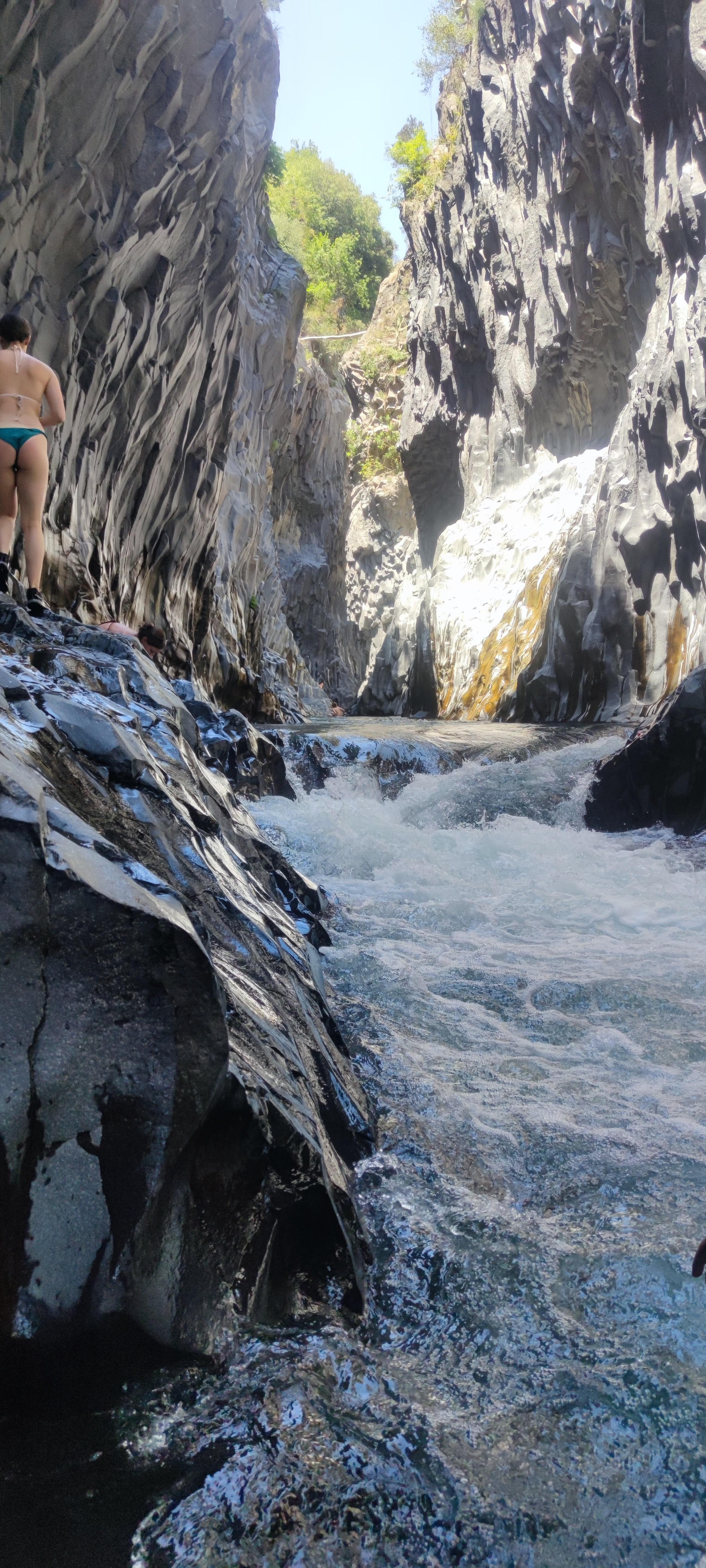 La mattina presto lasciamo l'area sosta di Giardini Naxos e proseguiamo il nostro viaggio alla volta delle Gole dell'Alcantara, arrivati a destinazione lasciamo il camper nel parcheggio davanti all'ingresso, offerta libera, ed optiamo per l'ingresso basic (10 euro a persona) ascensore ed escursione in autonomia.