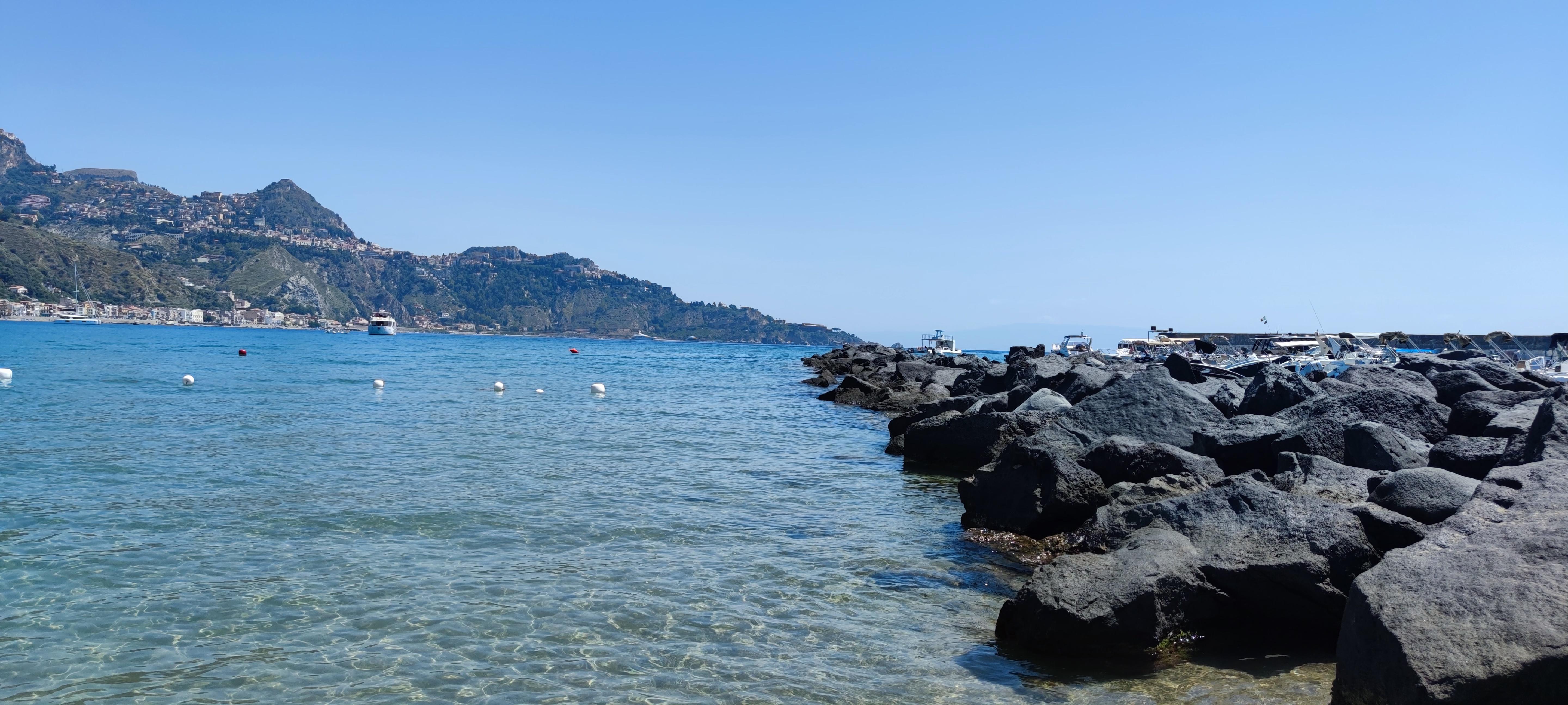 Arriviamo a Giardini Naxos presso l'area sosta Lagani. L'area è curata e comoda per raggiungere la spiaggia a piedi e Taormina con i mezzi pubblici. La piazzola, su mattonelle, è dotata di ombrellone, tavolo e sedie, doccia e lavandino (21 euro al giorno).