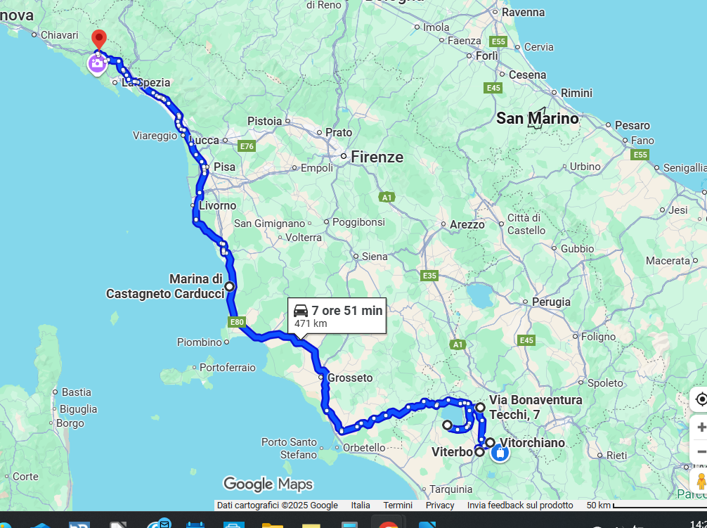 Usciamo a Sarzana e continuiamo su SS1 Aurelia, facciamo varie fermate e arriviamo nel tardo pomeriggio a Marina di Grosseto, mi dirigo al parcheggio in via Letizia, nella pineta, abbastanza squallido, molto sconnesso e, onestamente, per pagare € 12 senza servizi, preferisco andare all'area camper Oasi di Maremma, in Via delle Collacchie. Per €16 bella piazzola con carico e scarico, ma soprattutto posto sicuro. Ci piazziamo, doccia, cena e bella dormita.
