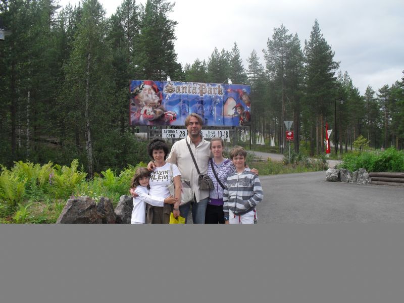 Ci alziamo vista mare ….che belloooo!!! Il cielo e’ coperto ma questo posto e’ affascinante anche cosi’. Ci avviamo verso Rovaniemi, quasi pare impossibile arrivarci con il camper, i bimbi sono impazienti ed anche noi e ci accompagna un sole splendente, fa caldo. Quando vediamo la scritta Rovaniemi all’entrata della citta’, mi fermo per una foto di rito col cartello non ci pare vero siamo qua! Girando per la citta’ vediamo l’albergo Rantasipi Phojanovi dove siamo stati a Novembre del 2007 e anche questo pare incredibile, lo ricordavamo immerso nel ghiaccio in un’atmosfera natalizia, ora era la’ con noi in mezzo al verde e gli batteva il sole addosso, passiamo proprio sul famoso ponte che vedevamo quando cenavamo. Dopo questo tuffo nel passato di non poche emozioni per noi, ce ne andiamo al Santa Park che non abbiamo visitato la scorsa volta.