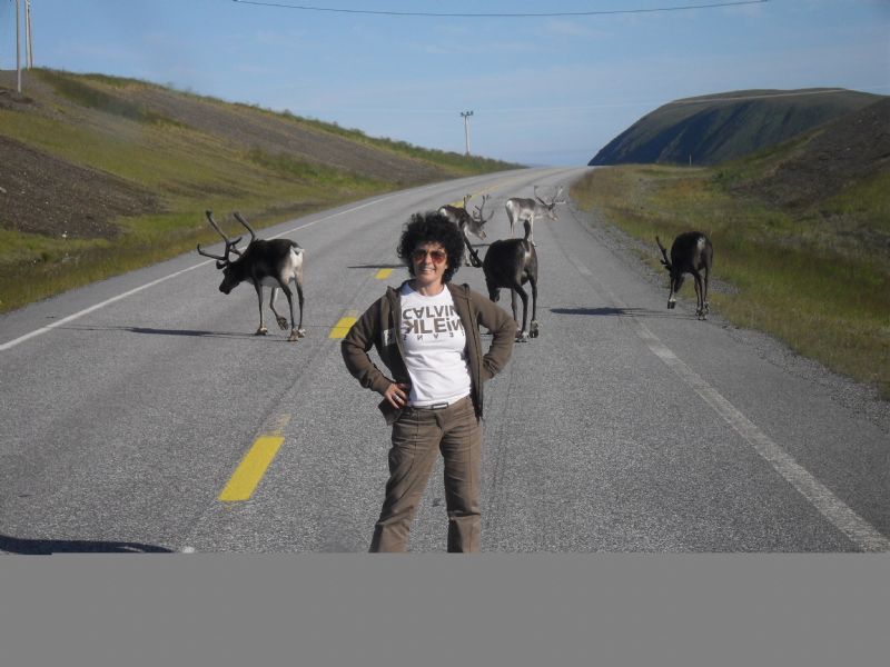 Ci fermiamo dopo Inari ad un negozio di oggetti nordici, la gente ha quasi i tratti somatici eschimesi, le macchine trasportano pelli di renna e attrezzi per l’inverno o per andare a caccia, fino a qualche anno fa’ gli orsi vivevano qui e si cibavano dei cadaveri nei cimiteri…………e’ un altro mondo. Di nuovo per strada, praticamente stiamo tutti davanti a vedere le cose che ci circondano, la strada e’ impervia, piena di curve stretta che quando incroci un altro camper o un camion devi quasi fermarti, poi avallamenti, sali-scendi al 10% costeggiando sulla destra il mare e a sinistra la montagna. Si sale sempre piu’. Quando mancano 100 km le Renne sono numerosissime, ti attraversano la strada all’improvviso, non si scansano e sei costretto a fermarti e ne approfittiamo per delle istantanee. Insomma tutto diventa cosi bello e difficile ma….molto affascinante.