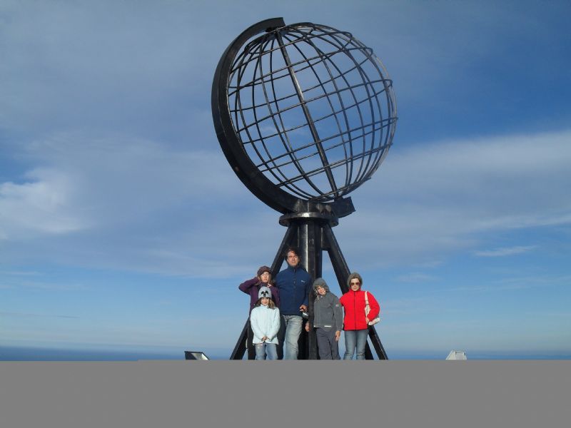 Imbocchiamo il famoso tunnel di 7 km precisamente 6870 mt per meta’ in discesa e meta’ in salita (70 euro andata e 70 euro ritorno), tanto che ho dovuto mettere la seconda per un momento, siamo all’isola di Mageroja e passiamo Honnisvag. Non ci fermiamo vogliamo arrivare!! Si sale, praticamente tutte curve e colline poi il deserto e mare. Poi ad un tratto scorgiamo da lontano in salita un gabbiotto, con la scritta Nordkapp, (scendiamo e facciamo la foto anche con lui), ci avviciniamo vogliono 80 euro per 2 notti senza acqua pozzetto ed altro ma c’era lui………..il Mappamondo simbolo del punto piu’ settentrionale d’Europa. Parcheggiamo il mezzo e col sole pieno notiamo il piazzale pieno di camper e una gran soddisfazione di essere arrivati li, con tutti i miei figli. Avevo promesso a me stesso che ce l’avrei fatta. Veder Daniela dopo quello che ha passato ridente saltellare di gioia e i miei tre gioielli contenti per aver raggiunto quel posto, e’stato per me una delle piu’ grandi soddisfazioni . Insomma, li non c’era un gran che, era finita la strada e quindi ci siamo goduto questa giornata. Ma chi ti incontriamo? E si ancora loro gli olandesiii!!!