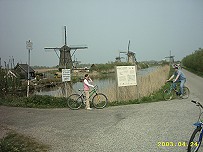L'ultima tappa olandese sono i diciannove mulini a vento di Kinderkirk; lasciamo il camper posteggiato dove ci sembra un posto accettabile e proseguiamo in bicicletta, percorrendo stradine di campagna. Qui Sara ed io incontriamo un distinto signore che indossa i suoi zoccoli di legno e pedala la bici (chissà se io ne sarei capace??).