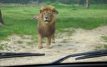 Superiamo diversi sbarramenti e ci troviamo quindi nella sezione dei felini, dove incontriamo per primi i leoni. Li osserviamo con rispetto ed ammirazione, mentre conducono le loro attività (due maschi si fronteggiano, presumibilmente per una femmina, ma ci sono anche dei cuccioli, separati forse per proteggerli). Al nostro passaggio le schermaglie dei due maschi li conducono proprio di fronte a noi, e possiamo osservarli da vicino, ed anche fotografarli (facendo attenzione a non usare il flash, per non dar loro fastidio).