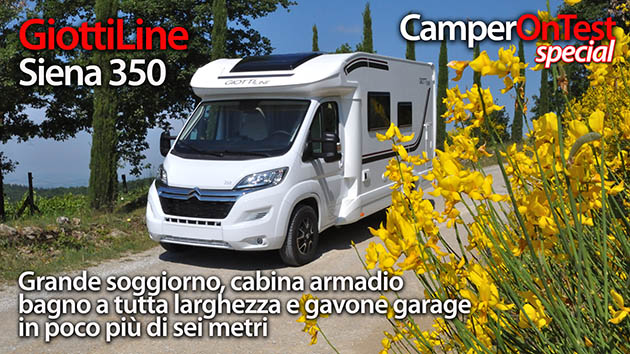 | Descrizione | Il nuovo GiottiLine Siena 350 è un profilato compatto con letto basculante che propone uno schema abitativo senza letto sempre pronto in coda, a tutto vantaggio dello sviluppo delle zone giorno e servizi, con grande bagno in coda a tutta larghezza dotato di capiente cabina armadio. E che non manca di offrire un gavone in grado di ospitare anche due biciclette. Lo abbiamo provato nella splendida cornice delle colline toscane del Chianti. |